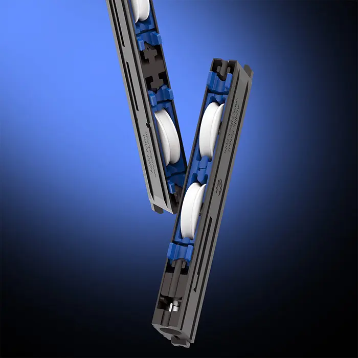 创新的自动高低平衡系统,让滑轮受力时可确保乘载重量平均分配,使每个轮子保持一致的轨道接触, 大幅降低了门或轨道中的任何障碍物对行进中滑轮造成的影响。